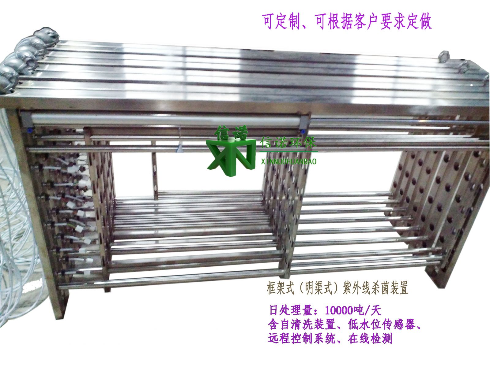 二、產(chǎn)品介紹框架式(明渠式)紫外線消毒器是通過(guò)布置于開槽溝渠 內(nèi)的紫外消毒模塊上的紫外燈發(fā)出中心輻射波長(zhǎng)為253.7nm的短波紫外線對(duì)流經(jīng)溝渠的水體進(jìn)行殺菌消毒,從而解決處理后的污水細(xì)菌指標(biāo)的超標(biāo)問題,使**終排放水體的細(xì)菌學(xué)標(biāo)達(dá)到并超過(guò)國(guó)家相關(guān)排放標(biāo)準(zhǔn)及水質(zhì)標(biāo)準(zhǔn)要求。